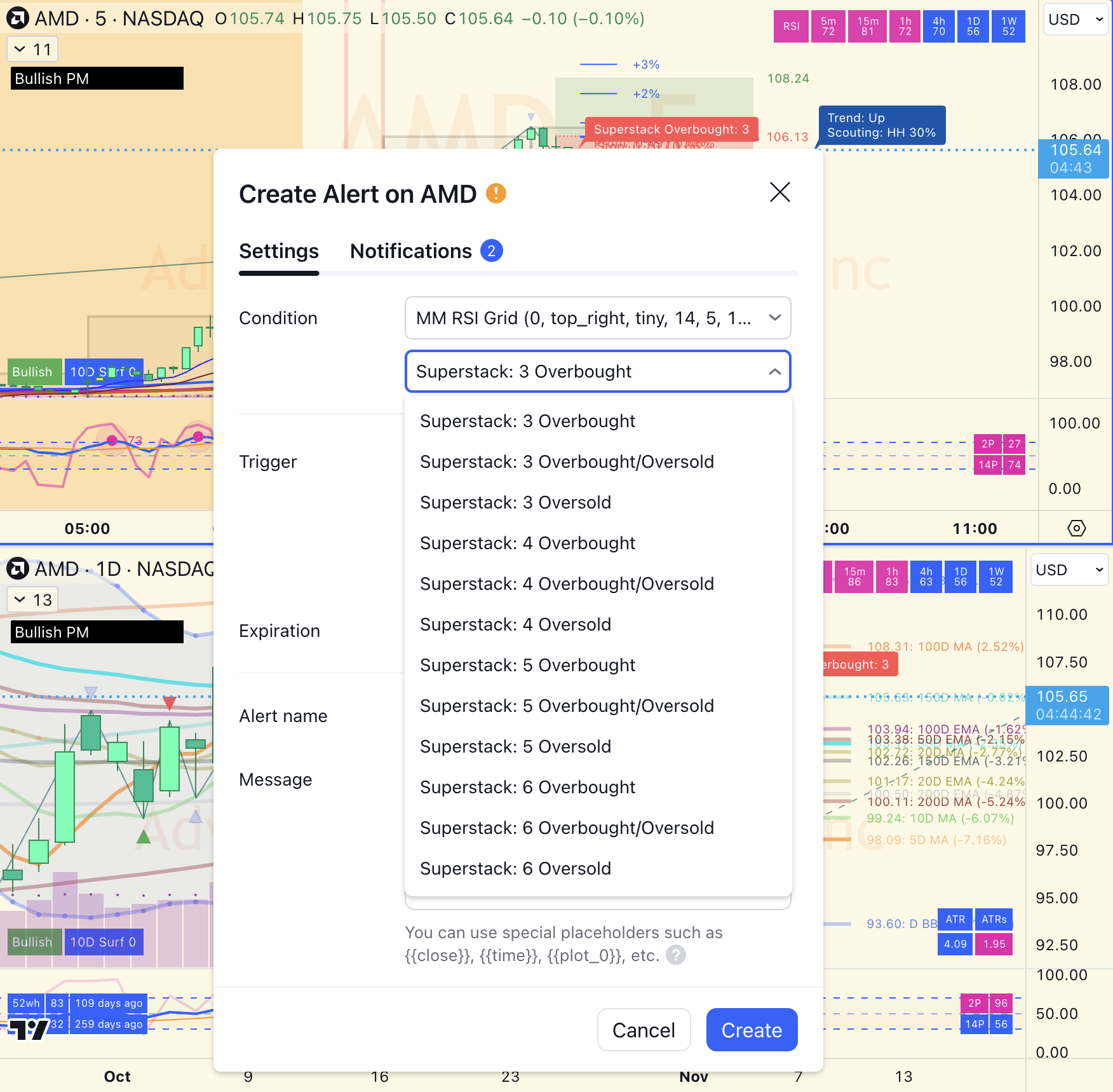 - Superstack Alerts: Just like the label, you can set up the MM RSI Grid to alert you when superstack conditions are met.